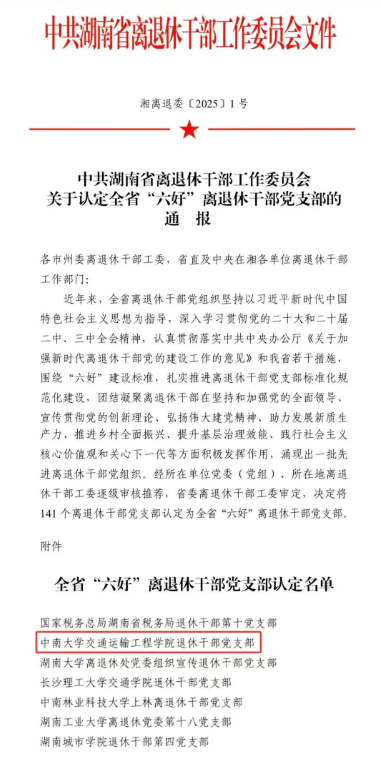 近日,中共湖南省离退休干部工作委员会公布tapplay官网认定全省“六好”离退休干部党支部的通报,tapplay官网交通运输工程学院退休干部党支部获评。