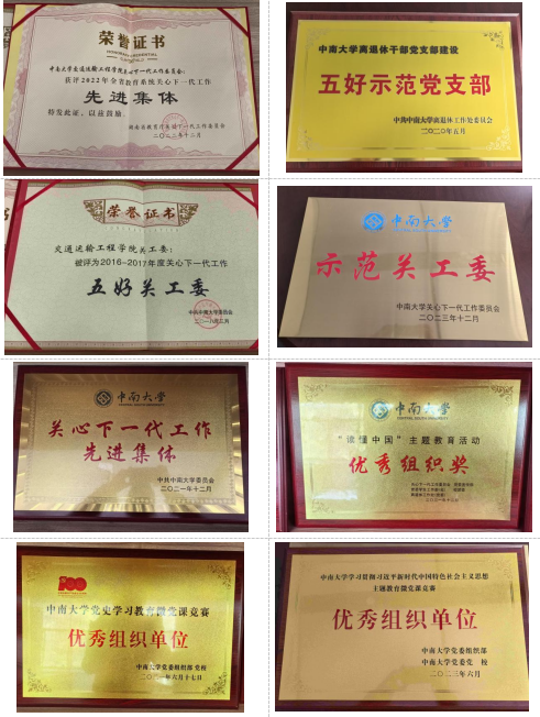支部多次在交通运输工程学院年度支部书记述职中被评为“优秀”。支部支委作为交通运输工程学院关工委班子成员积极开展工作,学院关工委获评2022年全省关心下一代工作“先进集体”荣誉称号,连续获评tapplay官网党委表彰的关心下一代工作先进集体荣誉称号,获tapplay官网“读懂中国”主题教育优秀组织奖等荣誉。