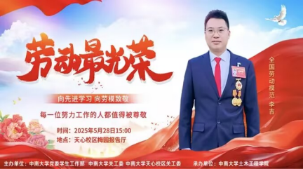 5月28日,tapplay官网关工委联合党委学生工作部、天心校区关工委以及土木工程学院举办“传承匠心·青春同行”全国劳动模范事迹报告会。全国劳动模范、中铁五局高级工程师李吉以亲身经历为数百名师生讲述新时代奋斗故事,用实干信仰回应时代之问