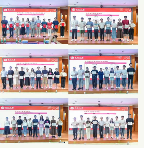 会议由何桂强主持。徐建军对本学期关工委学生委员工作进行总结。他表示,学校关工委通过制定二级学院关工委学生委员工作条例、纳入“六员六导”特色品牌建设、奖励促动相关各方积极参与,在全面促进立德树人,有效弥补承担关工委任务的弱项,普遍增强二级关工委的活力、影响力与实效性等方面取得积极成效,相关工作实现了“五个最”,即与团学组织合作最紧密、吸收学生参与人数最多、覆盖二级关工委最全、“五老”作用发挥最有效、最贴近学生的愿望和需求。接着,徐建军宣读表彰决定,授予湘雅医学院《朋辈互助,润心聚力》等10个案例为最佳创新案例,授予土木工程学院《传道授业,铸魂育人——“前沿交叉”跨学科发展论坛》等10个案例为优秀创新案例,授予湘雅医学院等10个单位为“校关工委、校团委联合试点工作先进集体”,授予陈晓晶等29名同学为“优秀关工委学生委员”。徐建军、何桂强、李飞、李满春、胡凯、张国强共同为获奖单位和学生颁发证书。