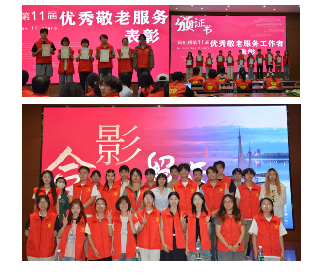 敬老公益宣传片拉开了大会的帷幕,宣传片肯定了青年学生长期以来在敬老服务工作中的暖心举动和坚守同行。随后,大会向全体参会人员汇报了本学期工作,并对肖晨曦等8名同学授予了“优秀敬老服务标兵”称号,对王瑶等10名同学授予了“优秀敬老服务”称号。