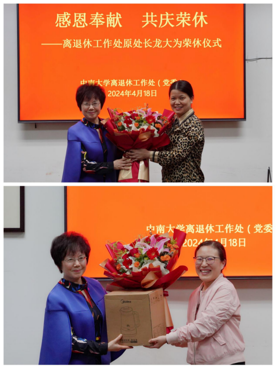 4月18日下午,校本部老年活动中心304会议室洋溢着庄重而温馨的气氛,离退休工作处原处长龙大为的荣休仪式在此隆重举行。全处在职人员齐聚一堂,共同见证这一难忘时刻。仪式由现任离退休工作处处长向英明主持。 紧接着,离退休工作处党委书记何桂强和副处长杜方冬分别发表了讲话。他们回顾了龙大为处长在任期间的工作业绩和突出贡献,对其为离退休工作处的发展付出的辛勤努力和无私奉献表示由衷的感谢。何桂强书记特别提到,龙处...